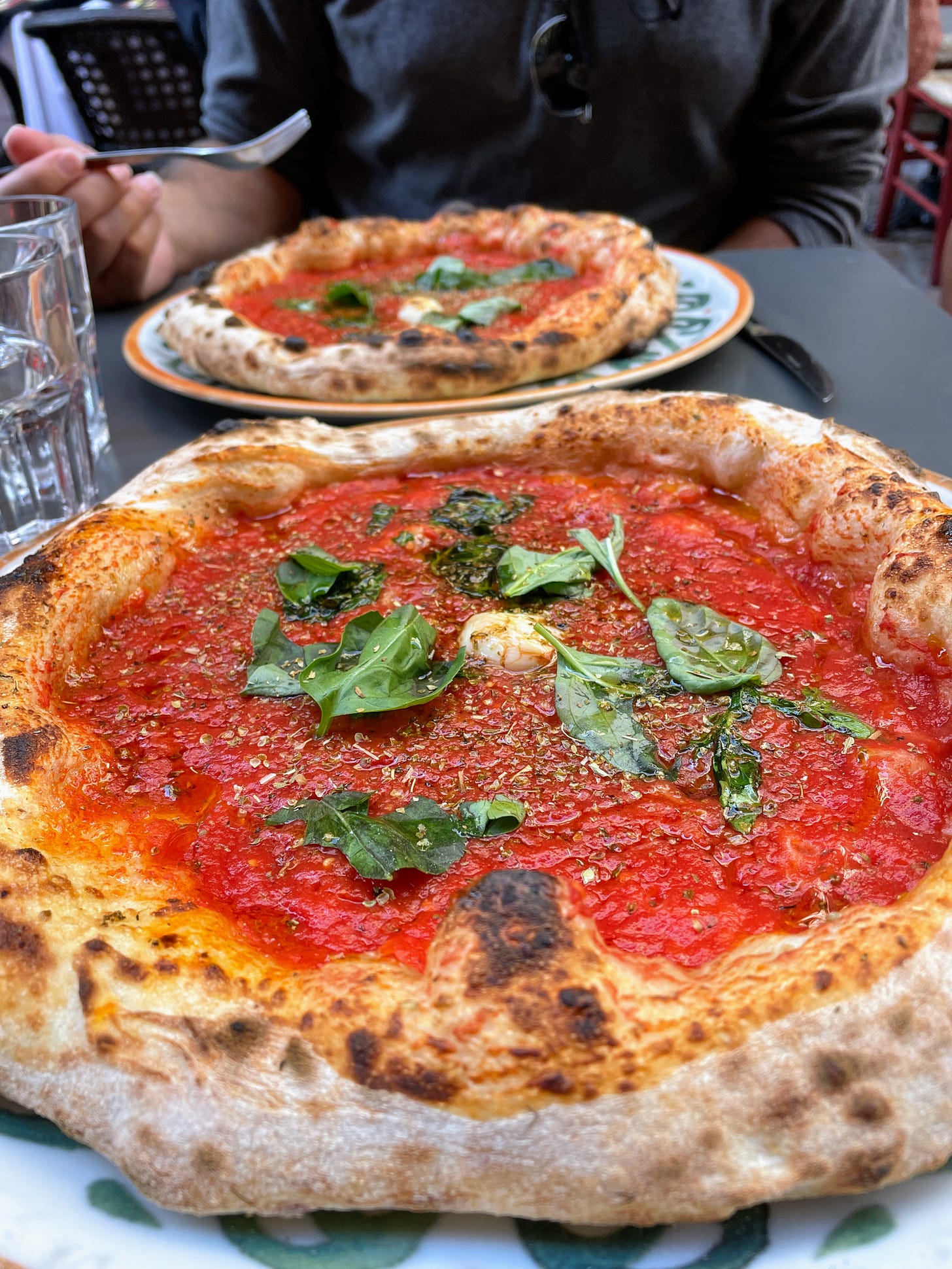 Any pizza place will make a cheese-free pizza for you. (Some may make or carry non-dairy cheese) Request veggies and fresh herbs for added flavor, texture, color, and nutrients. (In Italy, virtually every pizzeria serves pizza marinara, which comes without dairy cheese by default—no need to even ask for them to remove the cheese. My favorite pizza!)