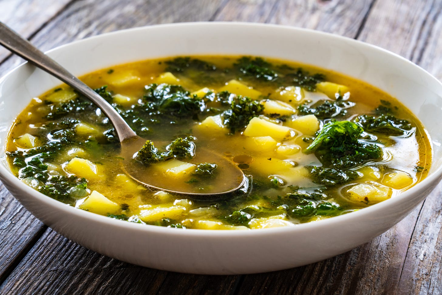 Add the greens, potatoes, and vegetable stock to the soup pot and bring to a low boil. Simmer everything together for about 25 to 30 minutes, until the potatoes can be pierced easily with a fork.