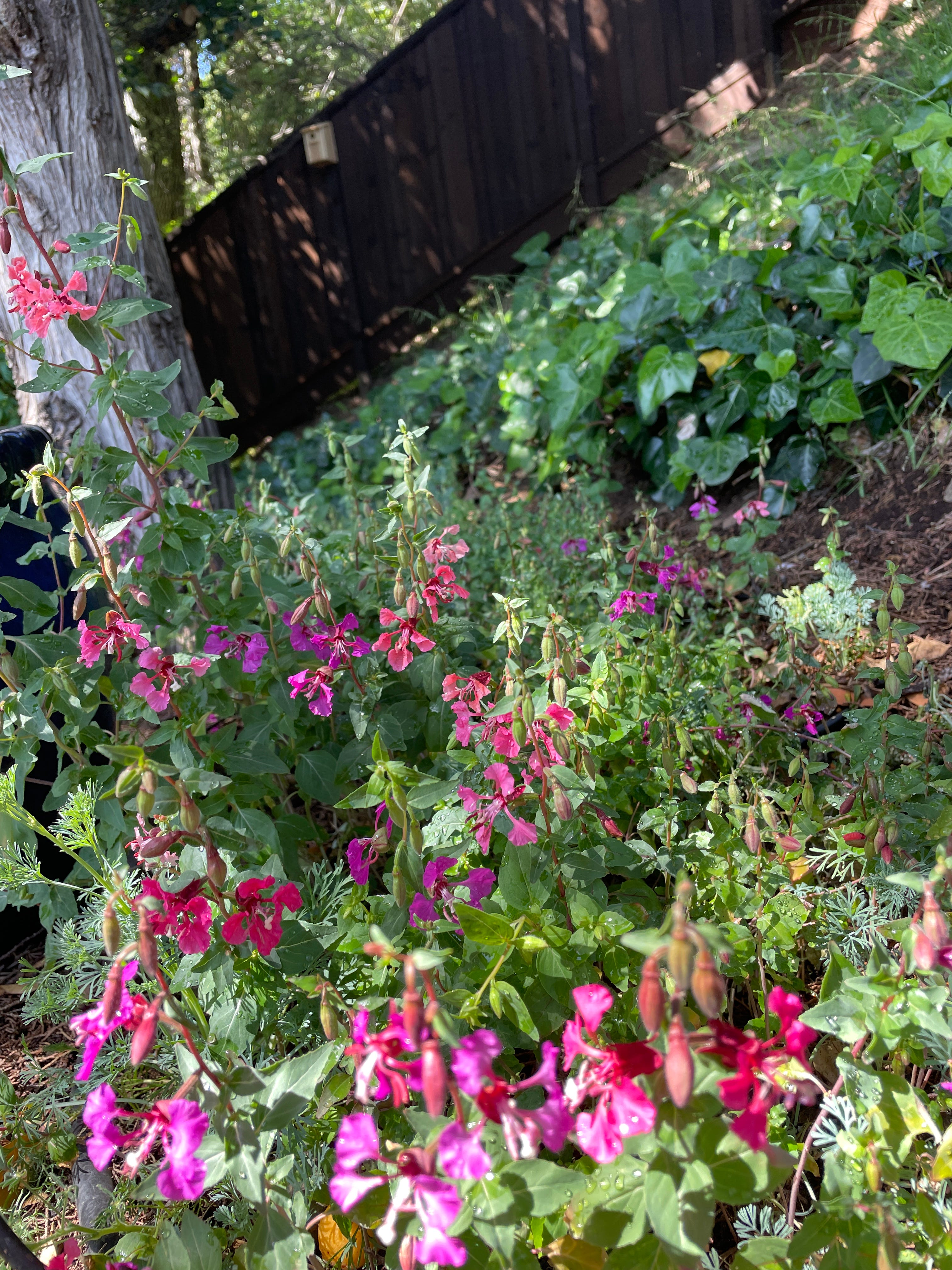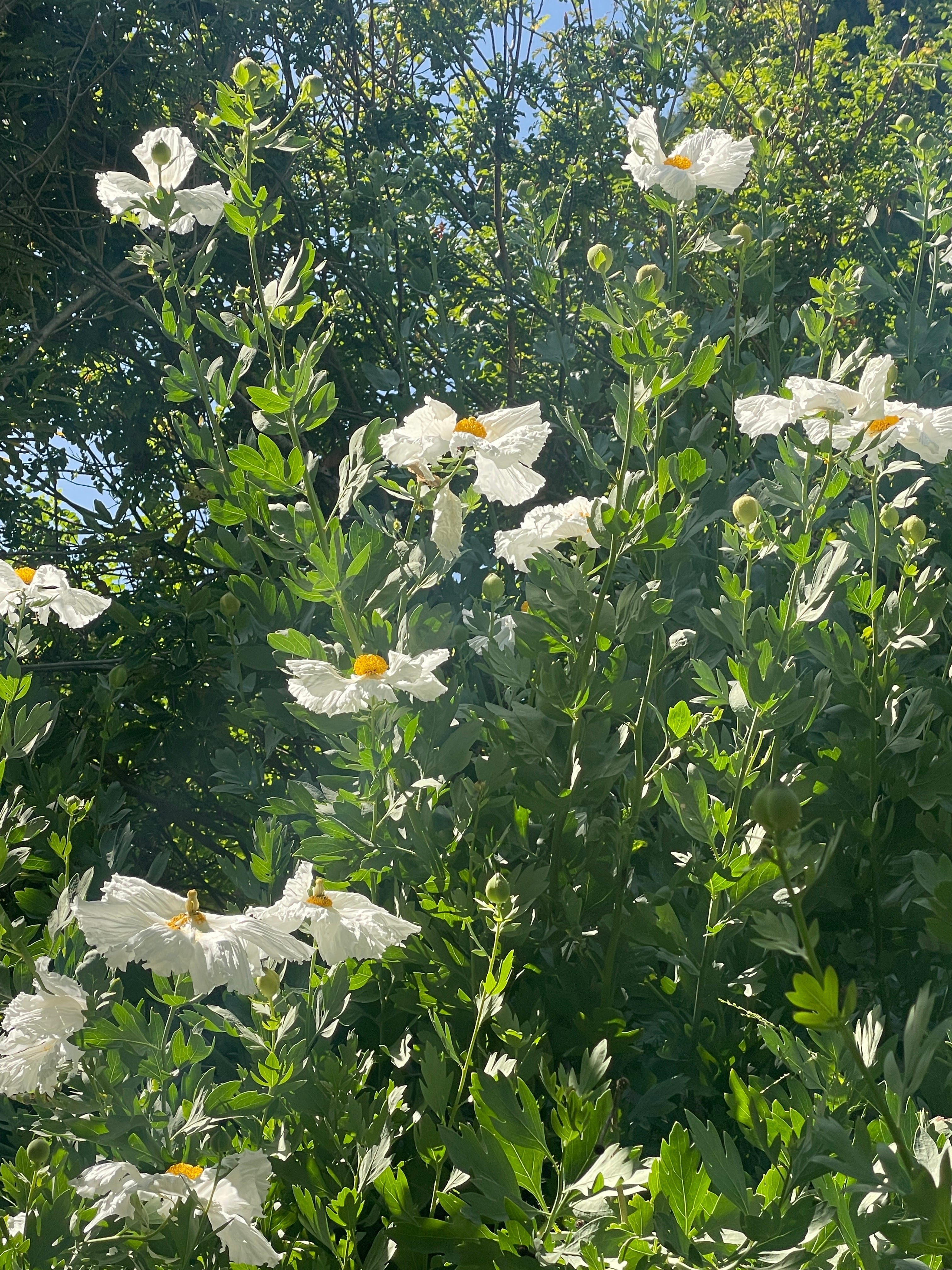 Reseeding and spread. Some wildflowers reseed themselves generously (hello, elegant clarkia), while others spread underground via rhizomes—like the Matilija poppy (Romneya coulteri), sometimes called the California tree poppy. These showstoppers are vigorous growers and can take over if not managed, but they’re also stunning and beloved by pollinators. We’re lucky to have a beautiful patch growing just beyond our fence in our neighbor’s hillside, and I’m thrilled it’s found its way to our side. I’ll be keeping an eye on it, but for now, I’m actually very happy it’s crossed the fence.