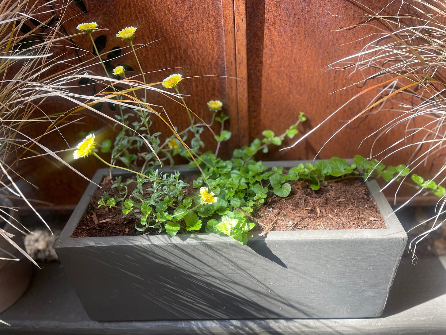 Then I kept going. I sowed seeds in another patch behind our outdoor entertaining area, and even filled an old wooden box that had just been sitting empty. All of it is now brimming with natives.