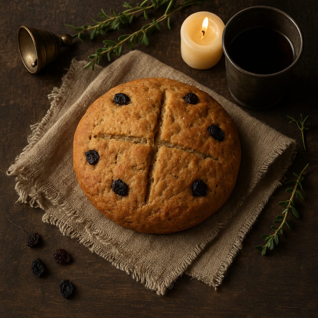 Barmbrack is a traditional Irish fruit bread enjoyed throughout Allhallowtide—Halloween, All Saints’ Day, and All Souls’ Day (and in some places on New Year’s Eve). While Halloween is the best-known date, the whole period is one of reflection and remembrance, and barmbrack—with its hidden charms and fragrant fruit—has long been part of the table.